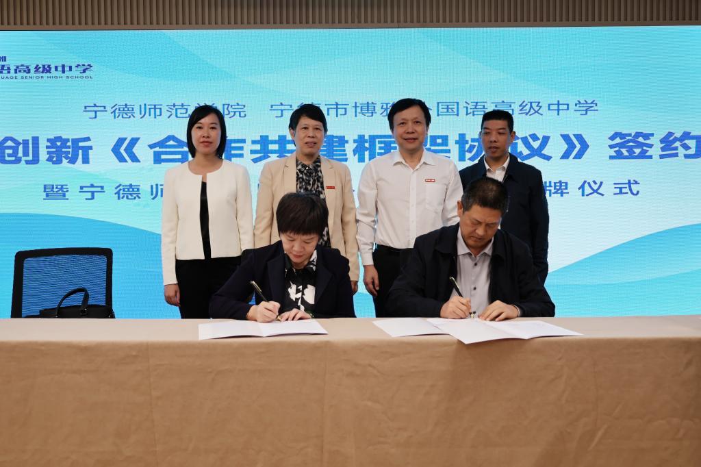 会上,我校党政办主任、发展规划处处长赖艳华与宁德市博雅外国语高级中学董事长林德链分别代表双方致辞并签署《合作共建框架协议》。教务处处长应少明代表我校向博雅外国语高级中学授予“宁德师范学院校外教学实践”牌匾。