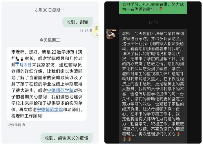 走访小组深入学生家庭,与学生及家长亲切交流,细致了解家庭经济状况、生活困难与实际需求,耐心解答家长关心的学业发展、就业前景等问题,并详细介绍国家助学贷款、助学金、校内勤工助学、学费减免等资助政策,同时送上慰问金。走访引发热烈反响,众多受访家庭以不同方式表达了对学校的感激之情。