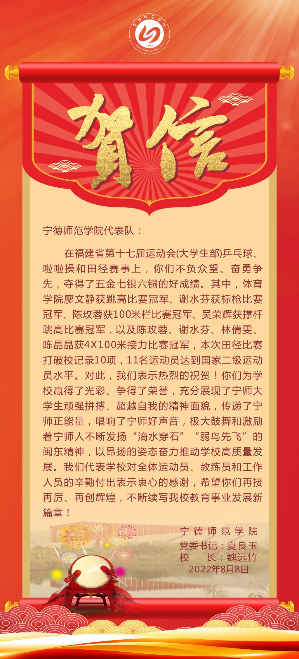 贺信:祝贺我校代表队在福建省第十七届运动会(大学生部)中勇创佳绩