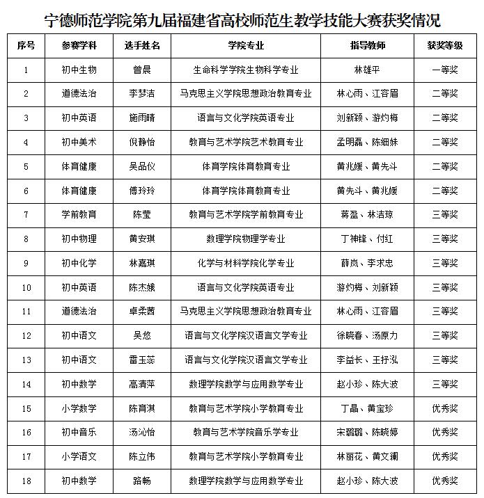 3月17-19日,第九届福建省高校师范生教学技能大赛在闽南师范大学举行。本届比赛由福建省教育厅主办,闽南师范大学承办,福建省普通教育研究室协办,全省32所院校的251名选手参赛。我校共有18名选手参加初中语文、小学数学、幼儿教育等13个组别的比赛,获得一等奖1项、二等奖5项、三等奖8项、优秀奖4项,学校连续第六年获得优秀组织奖。