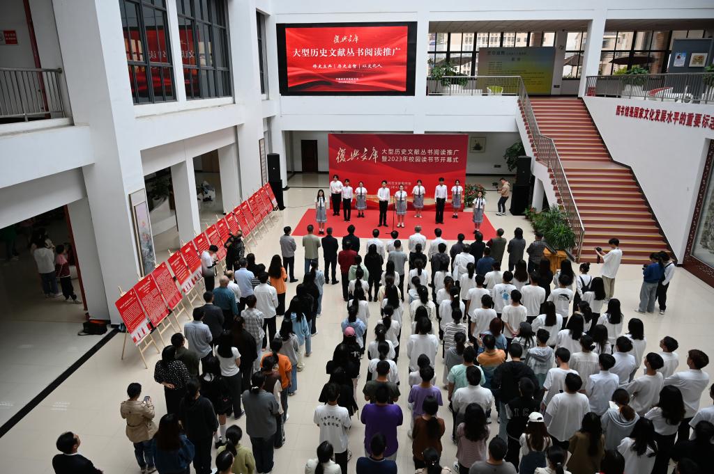 魏远竹在致辞中指出,由习近平总书记亲自作序的恢弘巨制《复兴文库》是一套反映中华民族伟大复兴的红色经典,我们要学好用好,不断坚定历史自信、把握时代大势。本届读书节是我校深入开展“典耀中华”主题读书行动的重要组成部分,他希望广大师生养成阅读习惯,涵养浩然之气;学好红色经典,把握精髓要义;弘扬传统文化,赓续文化血脉。
