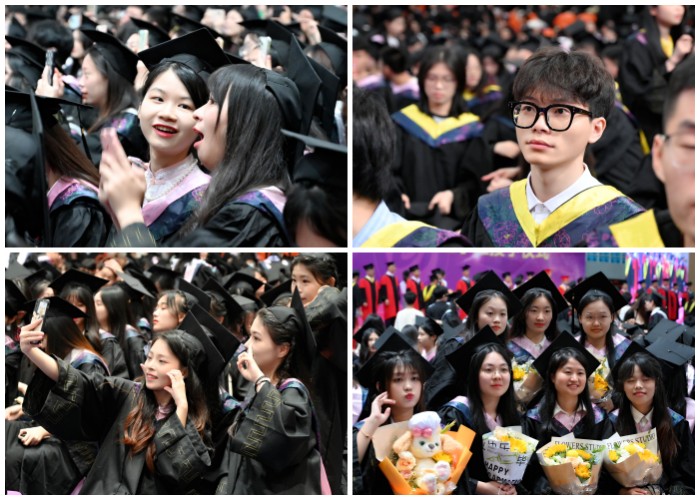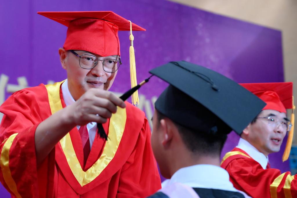 毕业典礼结束后,举行学士学位授予仪式。2023届2867名学生获学士学位,465名学生获评“优秀毕业生”。全体校领导和学位评定委员会委员依次为毕业生颁发学位证书,扶正学士帽流苏,合影留念。