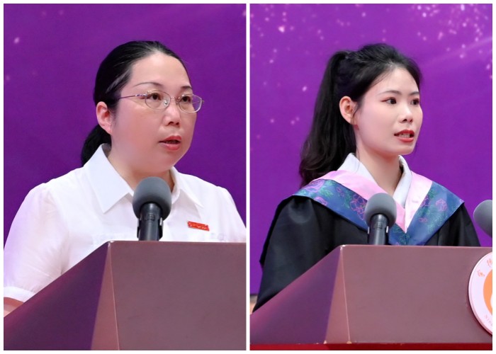 经济管理学院张光英教授以师长、学姐的身份勉励同学们带着嘱托勤奋努力、追求进步,做一个实干的人,锚定目标、勇毅前行,始终听党话、跟党走、感党恩,勇做新时代的奉献者!马克思主义学院思想政治教育专业沙惟奕同学作为优秀毕业生代表表达了对母校、对恩师的感激之情,表示将不负宁师人的使命与担当,在行动中感悟,在拼搏中成长,在平凡中创造不凡。