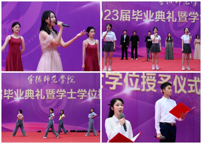 毕业典礼、学士学位授予仪式、歌伴舞、校友联络员聘任等同台进行,融仪式、音乐、朗诵于一体,钢琴、小提琴等全程演奏,形式多样、内容丰富。配乐诗朗诵《青春》、歌伴舞《一路生花》和歌曲串烧《云帆之歌》、《心愿》、《家在桃花溪》、《不说再见》、《春风十万里》等快闪表演,现场点燃同学们爱党爱国爱社会主义的热情,为即将步入社会的毕业生上了本科教育的最后一堂思政课。毕业生们纷纷表示,用这样的方式与大学四年的青春和母校告别很温馨,很有仪式感、荣誉感,在今后的人生道路上会谨记母校的教诲,脚踏实地,感恩奋进,努力成为对社会对国家有用的人。