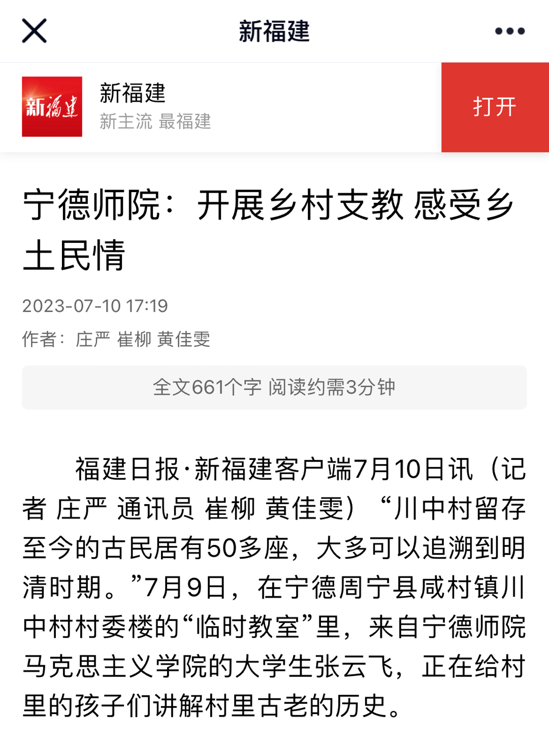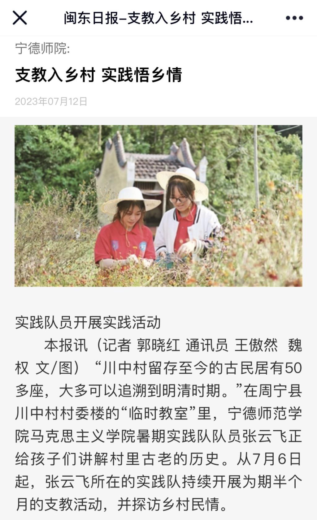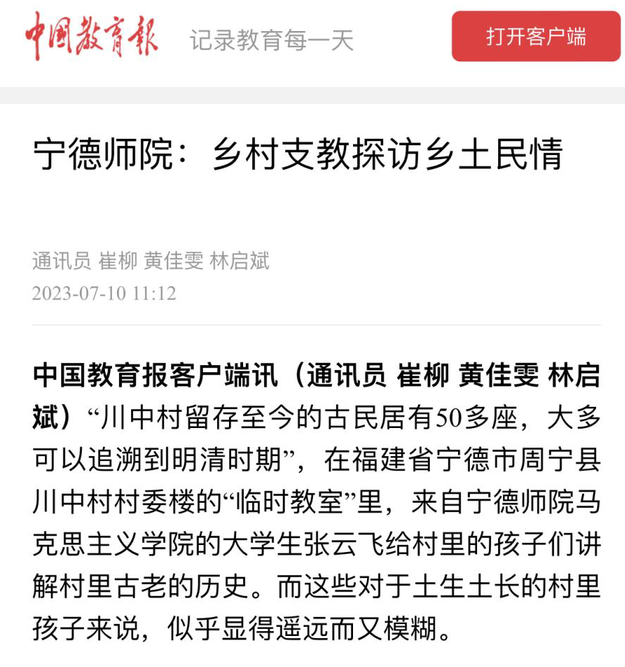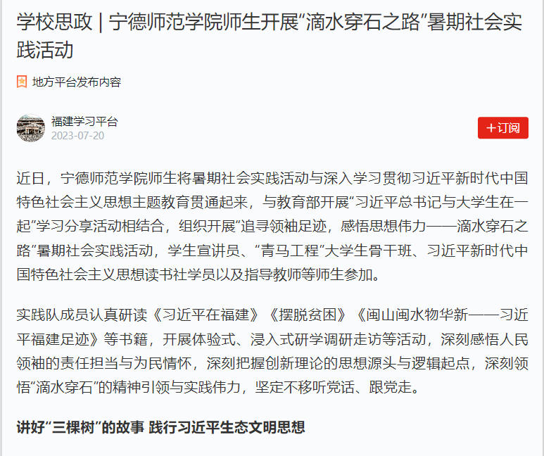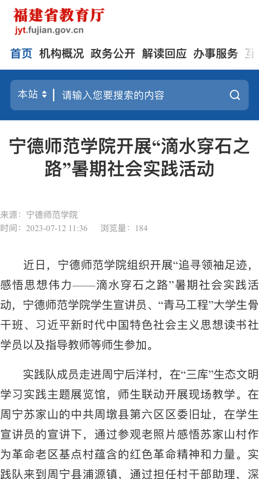 自7月启动以来,我校以“学习二十大 永远跟党走 奋进新征程”为主题的2023年暑期社会实践活动扎实推进、成效显著,受到学习强国平台、中国教育报、新福建、闽东日报等主流媒体的广泛关注和报道。