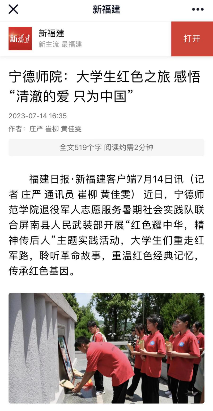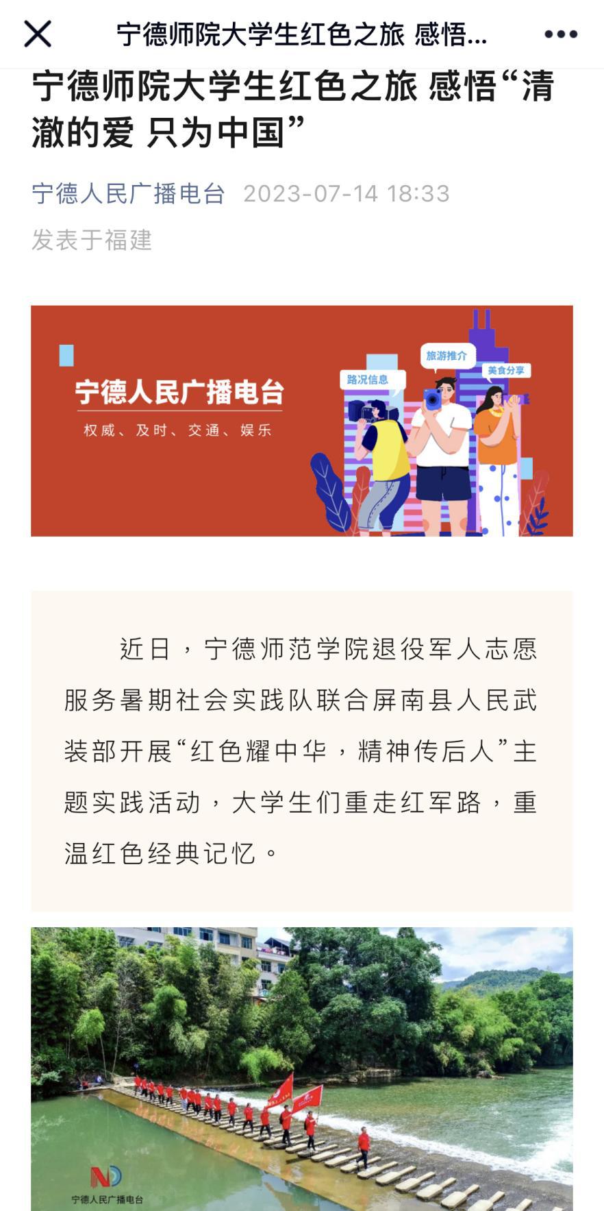 我校退役军人志愿服务暑期社会实践队联合屏南县人民武装部开展“红色耀中华,精神传后人”主题实践活动,大学生们重走红军路,聆听革命故事,重温红色经典记忆,传承红色基因。