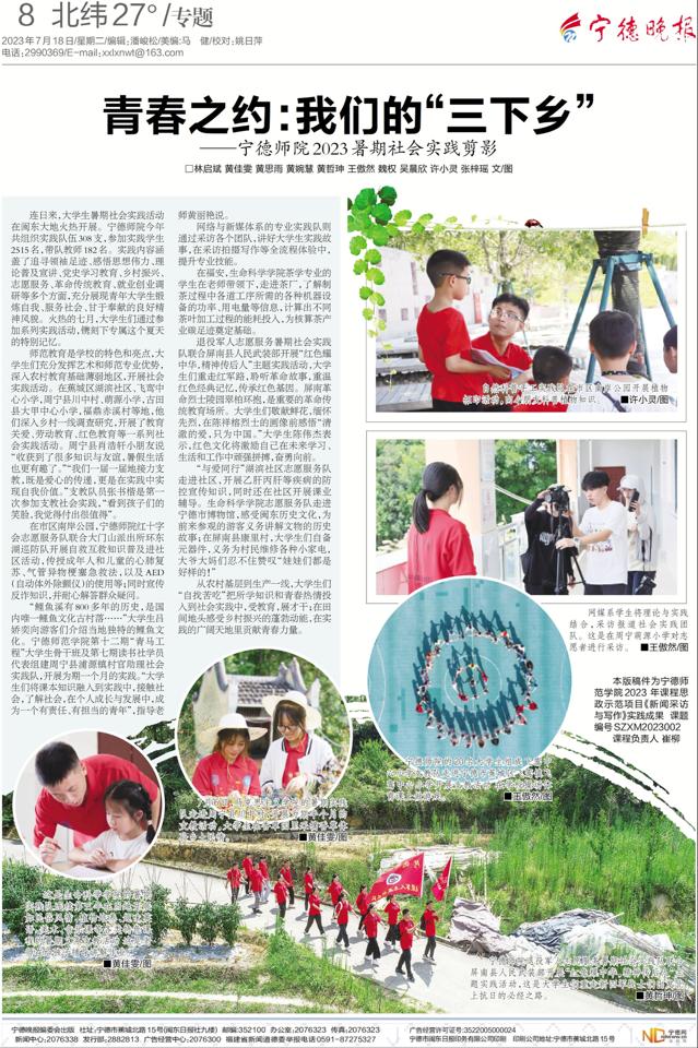 网络与新媒体系的专业实践队通过采访各个团队,讲好大学生实践故事在采访拍摄写作等全流程体验中,提升专业技能。宁德晚报专版刊发网媒系师生团队,记者团采访的学校三下乡社会实践稿件。