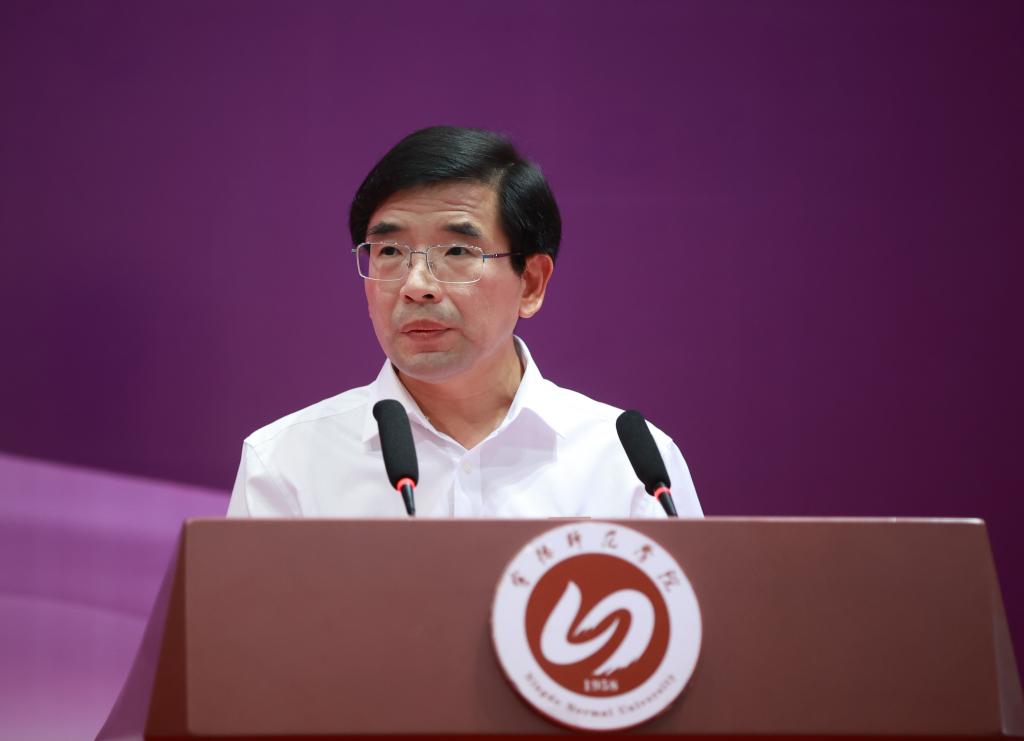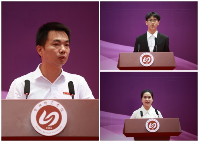 教师代表信息与机电工程学院副院长、教授赖联锋,老生代表教育与艺术学院2020级学生林希,新生代表化学与材料学院2023级学生陈垚志先后发言。赖联锋以自己的求学、教学、科研经历为例,勉励新同学不懈追求信仰之光、不怠钻研学问之道、不忘感悟生活之美,做一名有理想、敢担当、能吃苦、肯奋斗的时代好青年。林希与全体新生分享了自己在大学的思考与体会,鼓励新同学不忘初心、追逐梦想,踔厉奋发、笃行不怠,小步快跑、风雨兼程,在青春的赛道上奋力奔跑,展示新一代宁师学子的闯劲、锐气与担当。陈垚志表达了对今后的大学生活的憧憬,并代表全体新生表态将铭记“崇德 弘毅 厚学 笃行”的宁师校训,踏踏实实做好每件事,用智慧和勇气去创造宁师更加辉煌完美的明天。