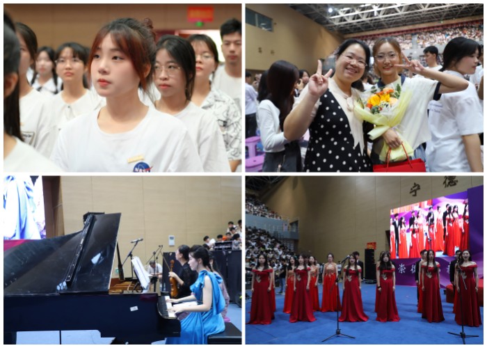 开学典礼现场,还举行了新生佩戴校徽仪式。校领导为新生代表佩戴校徽,全体同学郑重地将校徽佩戴在左胸前,将责任牢记心间。一枚小小的校徽,承载的是一份传承、更是一份责任,“宁师人”的精神,“宁师人”的使命,在新生的心中生根发芽。开学典礼还融入了配乐诗朗诵《你好,新同学!》、原创畲族舞蹈《绿雪畲山情》、混声合唱《云帆之歌》等暖场节目。辅导员们还为当天在座的共有11位同学过生日,送上蛋糕、贺卡和礼物,为他们献上生日祝福。