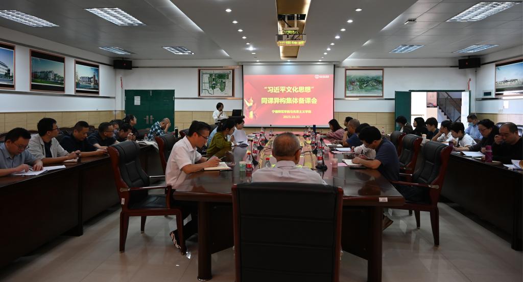 为深入贯彻落实习近平总书记对宣传思想文化工作作出重要指示精神,全面推动习近平文化思想融入高校思想政治理论课教学,扎实推进思政课改革创新,打造高水平思政课堂,10月31日下午,马克思主义学院开展“习近平文化思想”同课异构集体备课会,校党委书记夏良玉,党委副书记江潮炳,教务处相关负责人以及马克思主义学院全体思政课教师参加了集体备课会。