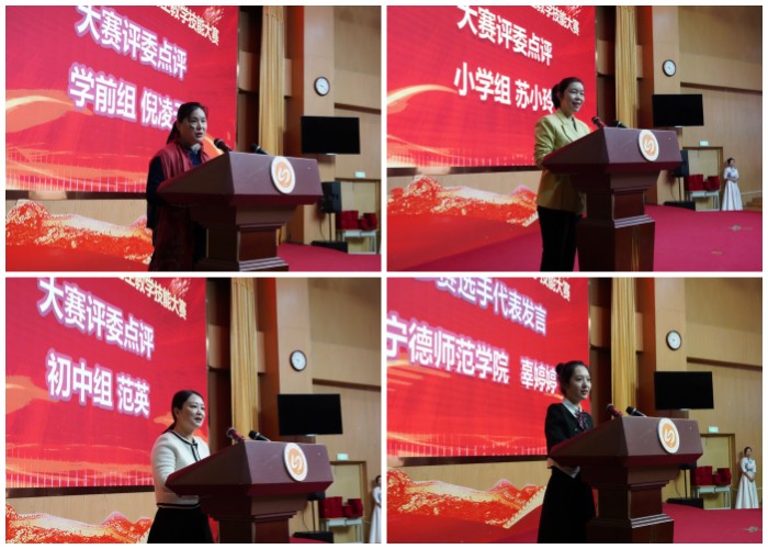 颁奖典礼上,东侨经济技术开发区实验幼儿园倪凌云老师、宁德师范学院附属小学苏小玲老师、宁德教师进修学院范英老师代表大赛评委团分别对本届大赛学前组、小学组、中学组进行点评。她们既肯定了参赛选手的精彩表现,同时也提出了殷切的希望和改进的建议。