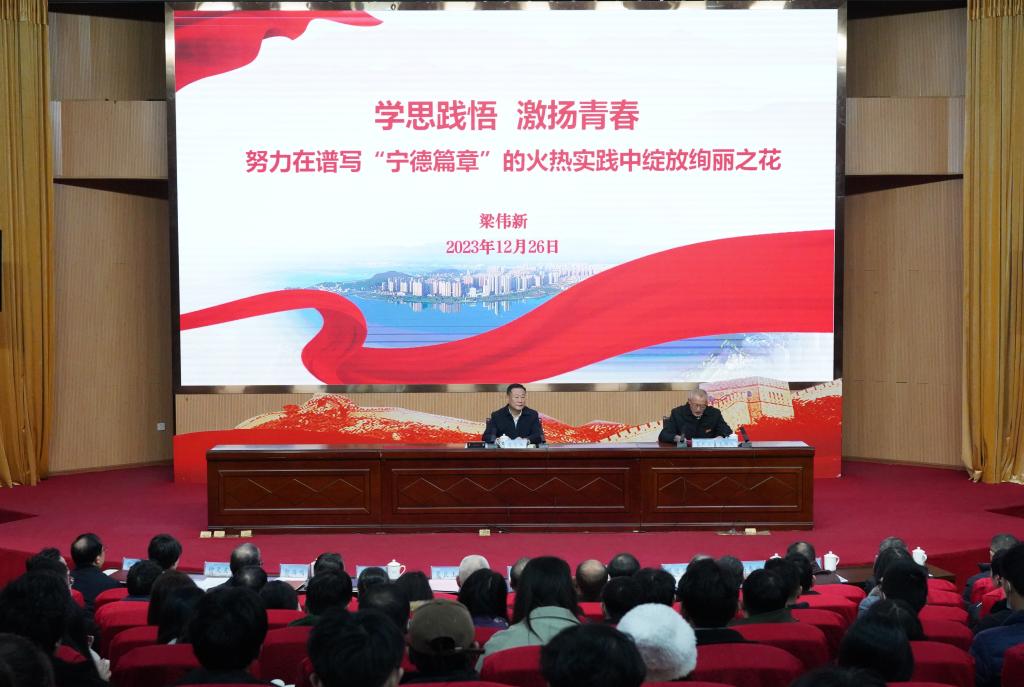 12月26日上午,中共宁德市委书记梁伟新莅校开展团员和青年学习贯彻习近平新时代中国特色社会主义思想主题教育调研暨思想政治理论辅导报告会。校党委书记夏良玉主持报告会。市委常委、秘书长蓝康昌,市委办公室、宣传部、市教育局、市人社局、团市委主要负责同志,市委办公室第一党支部全体党员,学校领导班子成员,党政办、宣传部、学工部、校团委负责人,各二级学院党委书记,“青马工程”第二期青年干部、青年教师培训班全体学员,团员和青年学生代表400多人参加报告会。