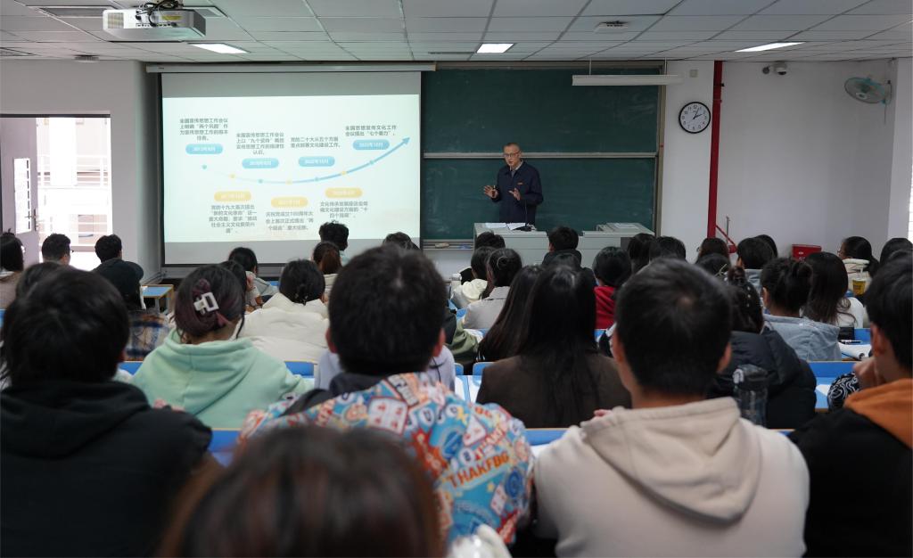 夏良玉详细阐述了习近平文化思想的丰富内涵,围绕为什么建设中国特色社会主义文化、为什么坚持马克思主义在意识形态领域指导地位的根本制度等内容展开,带领青年学子进一步明确建设中国特色社会主义文化的重要性和必要性,正确对待中华优秀传统文化、革命文化和社会主义先进文化,准确理解马克思主义在意识形态建设中的重要地位,深化对社会主义核心价值观的认识,进一步坚定文化自信,引导青年学子积极响应总书记在中国共产党第二十次全国代表大会报告中“立志做有理想、敢担当、能吃苦、肯奋斗的新时代好青年,让青春在全面建设社会主义现代化国家的火热实践中绽放绚丽之花”的号召。