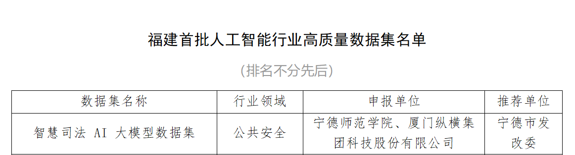 近日,福建省数据管理局正式公布首批人工智能高质量数据集名单,由我校牵头、厦门纵横集团科技股份有限公司联合参与建设的 “智慧司法 AI 大模型数据集” 成功入选。这一突破性成果标志着我校在人工智能基础数据领域实现了关键跨越,充分体现了我校在相关领域的专业积累与行业认可度,凸显了学校在该领域的科研实力与创新潜力。