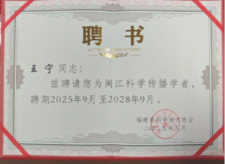 近日,福建省科学技术协会公布第八批“闽江科学传播学者”聘任人选名单,我校信息工程学院教师、数智宁德研究院院长王宁教授入选。9月1日,2025年全国科普月福建省主场活动在福州举行,省领导张彦、李德金、林瑞良、黄如欣,中国工程院院士、省科协主席付贤智、中国工程院院士吴明红,中国科学院院士焦念志等出席活动。活动现场,省领导为第八批闽江科学传播学者颁发聘书。