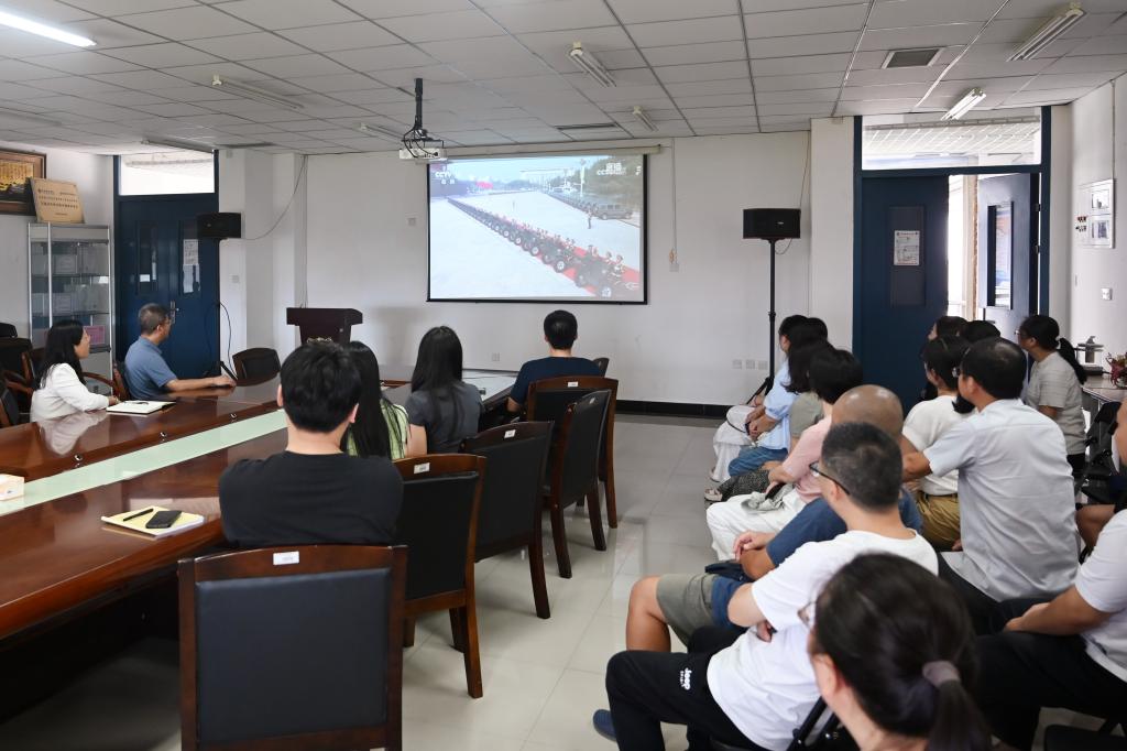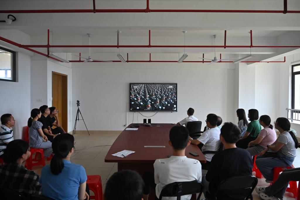 随着习近平总书记的检阅令响彻长安街,阅兵式正式开始。空中护旗梯队、徒步方队、战旗方队、装备方队、空中梯队和联合军乐团等45个方(梯)队依次通过天安门广场接受检阅,各方队气势恢宏、震撼亮相,生动体现了伟大抗战精神的当代传承,庄严宣示中国人民解放军听党指挥的坚定信念和中国人民铭记历史、珍爱和平的胜利成果,全景展现了新时代中国人民解放军制胜现代战争、维护世界和平的强大能力。现场氛围庄重而热烈,师生们全神贯注观看直播,不时为受阅官兵的整齐步伐、先进装备的震撼亮相鼓掌喝彩。