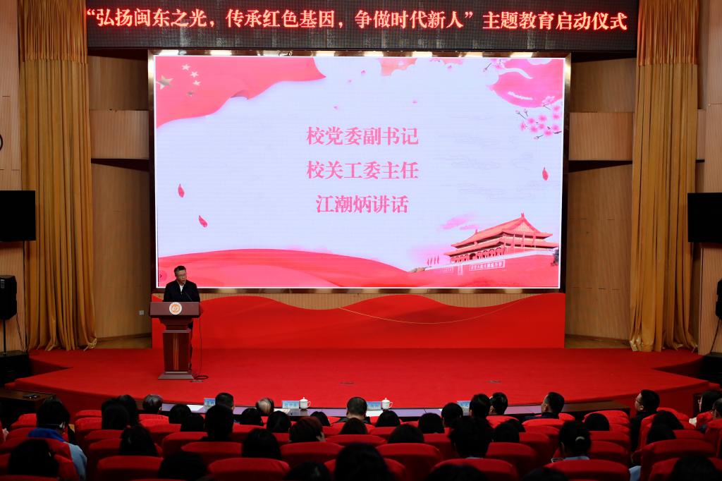 11月20日下午,我校关心下一代工作委员会(简称“校关工委”)在图书馆报告厅举行2025年“弘扬闽东之光,传承红色基因,争做时代新人”主题教育活动的启动仪式。校党委副书记、校关工委主任江潮炳出席仪式并讲话。校关工委常务副主任谢仲榛、各二级学院关工委主任、校关工委成员以及2025新生代表350余人参加了活动。