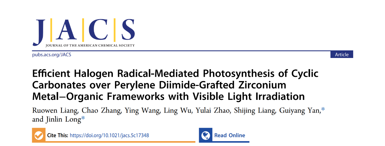近日,我校颜桂炀教授、梁若雯副教授团队与福州大学龙金林教授团队合作,以我校为第一署名单位在国际顶级期刊《Journal of the American Chemical Society》(JACS)上发表了题为“Efficient Halogen Radical-Mediated Photosynthesis of Cyclic Carbonates over Perylene Diimide-Grafted Zirconium Metal-Organic Frameworks with Visible Light Irradiation”的重要研究成果。这是我校历史上首次以第一作者、第一署名单位在该期刊发表研究成果,标志着我校在高水平基础与前沿化学研究方面实现了历史性突破。