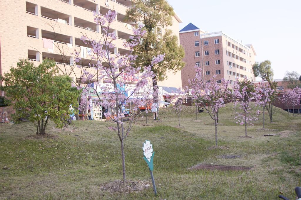 风传花信,雨濯春尘,一棵棵新栽的青苗迎风而立。不远处,去年种下的樱花树花开正艳,馥郁芬芳弥漫校园,三两成群的学子们于花影下穿梭,在教室里求知,享受宁师春日的美好时光。