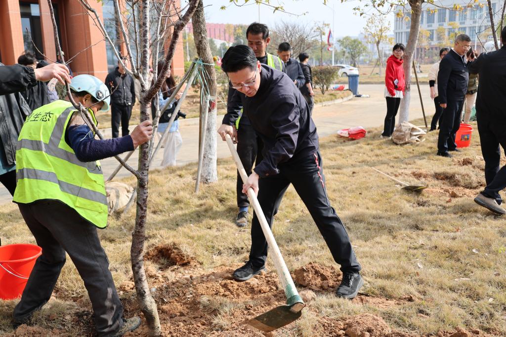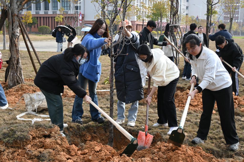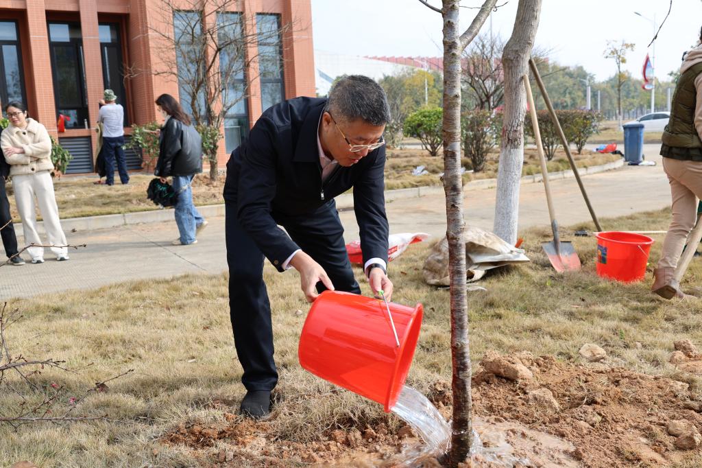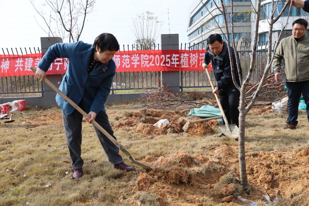 活动现场,师生们分组协作、挥锹铲土、扶苗填坑、培土围堰、提水浇灌,配合默契,干劲十足,合力将100余株承载着绿色希望的小树苗植入土壤,为宁师校园增添了一抹盎然春意。